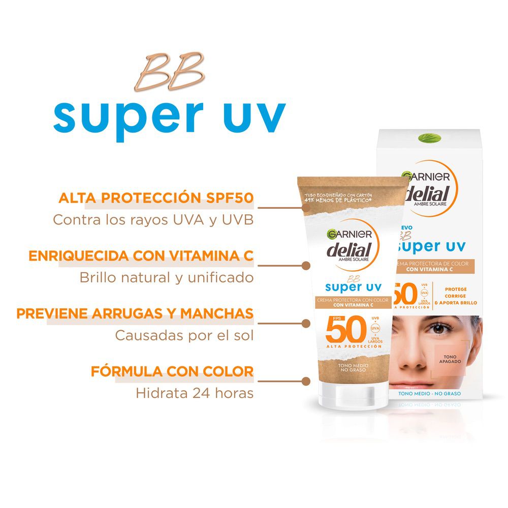 La BB Sun de Delial es una crema facial de muy alta protección con color especial para rostro y escote. Enriquecido con Vitamina E. Su fórmula con color se funde de forma natural con el tono de la piel. Además a la vez que protege de los rayos UVA y UVB; previene la aparición de arrugas y manchas causadas por el sol.