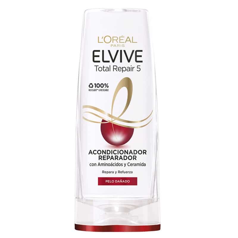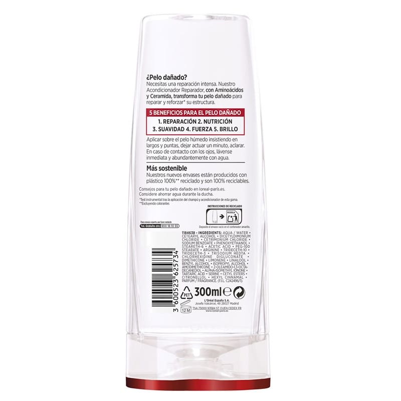 Acondicionador reparador para cabellos dañados, especialmente diseñado para una reparación total: 1/ Reparación 2/ Nutrición 3/ Suavidad 4/ Fuerza 5/Brillo