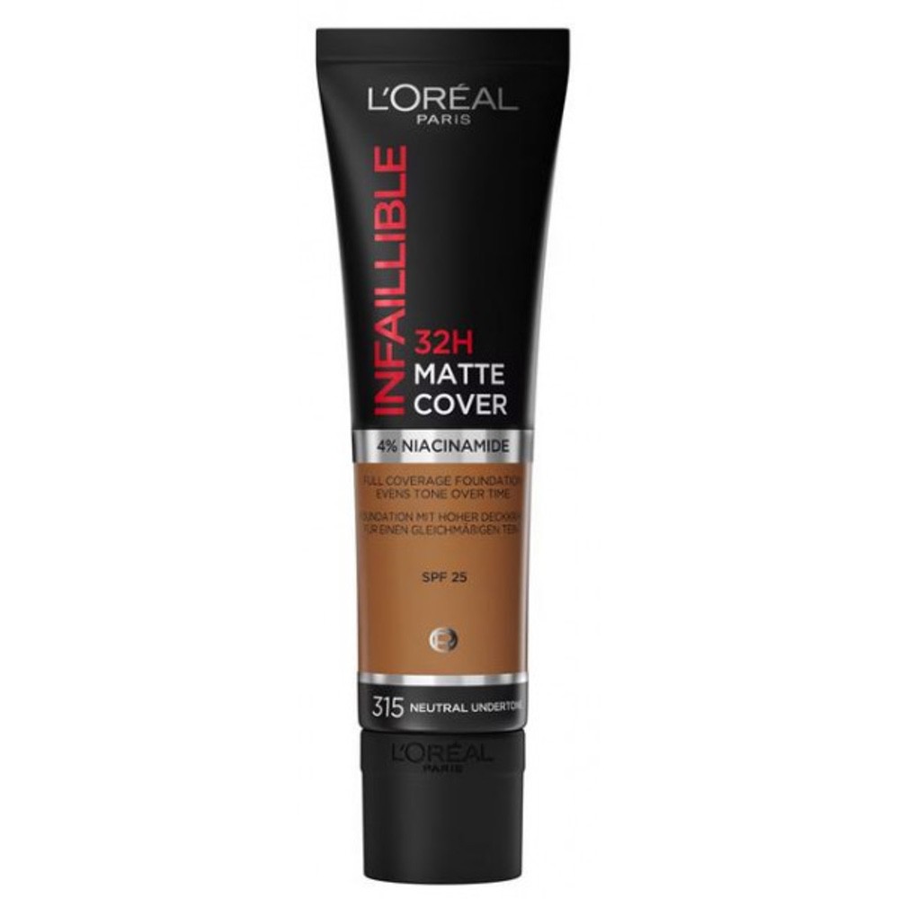 Llega la nueva fórmula L’Oréal Paris, Infallible 32H Mate Cover Tono cover 315 30ml. La nueva base de maquillaje con una textura ultra fluida que se adapta a tu piel para un acabado mate 32h*. Máxima cobertura mate durante todo el día para una piel sin brillos. Resistente al agua, al sudor y al calor, no comodogénica y dermatológicamente probada. Cubre todo tipo de imperfecciones (rojeces, acné, imperpigmentación) y apta para todo tipo de pieles, incluso las más sensibles. La primera base formulada con un 4% de Niacinamida, un ingrediente único que consigue unificar el tono un 20% en 4 semanas y que alisa visiblemente la piel con el paso del tiempo. *Test en 103 mujeres. – Resistente al agua, al sudor y al calor
