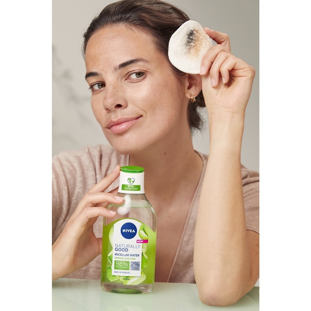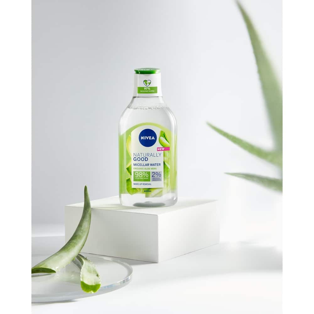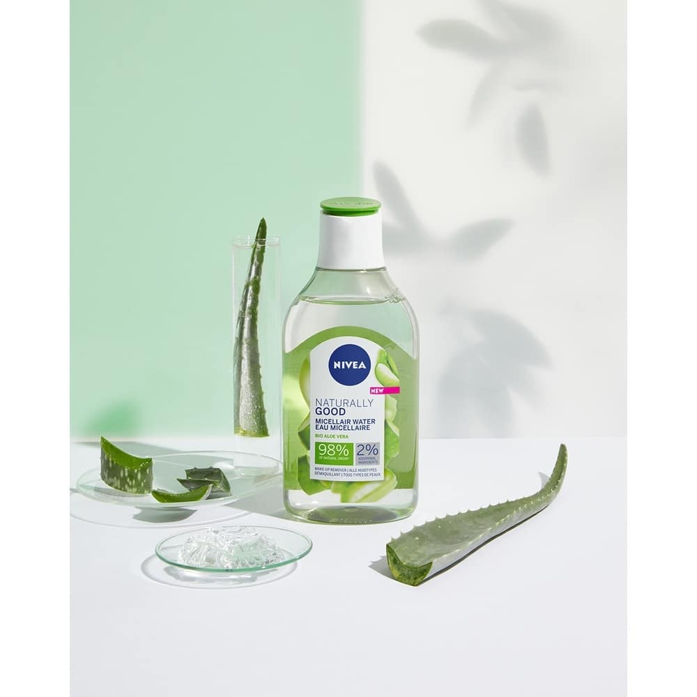 NIVEA Naturally Good Agua Micelar. Su fórmula todo-en-1, enriquecida con Aloe Vera BIO, elimina eficazmente todo el maquillaje e impurezas, limpia suavemente, refresca e hidrata la piel. Con 98% de ingredientes de origen natural y 2% de ingredientes adicionales necesarios para garantizar la estabilidad y seguridad de la fórmula. Botella fabricada con 97% de material reciclado. Fórmula vegana. Dermatológica y oftalmológicamente comprobado.