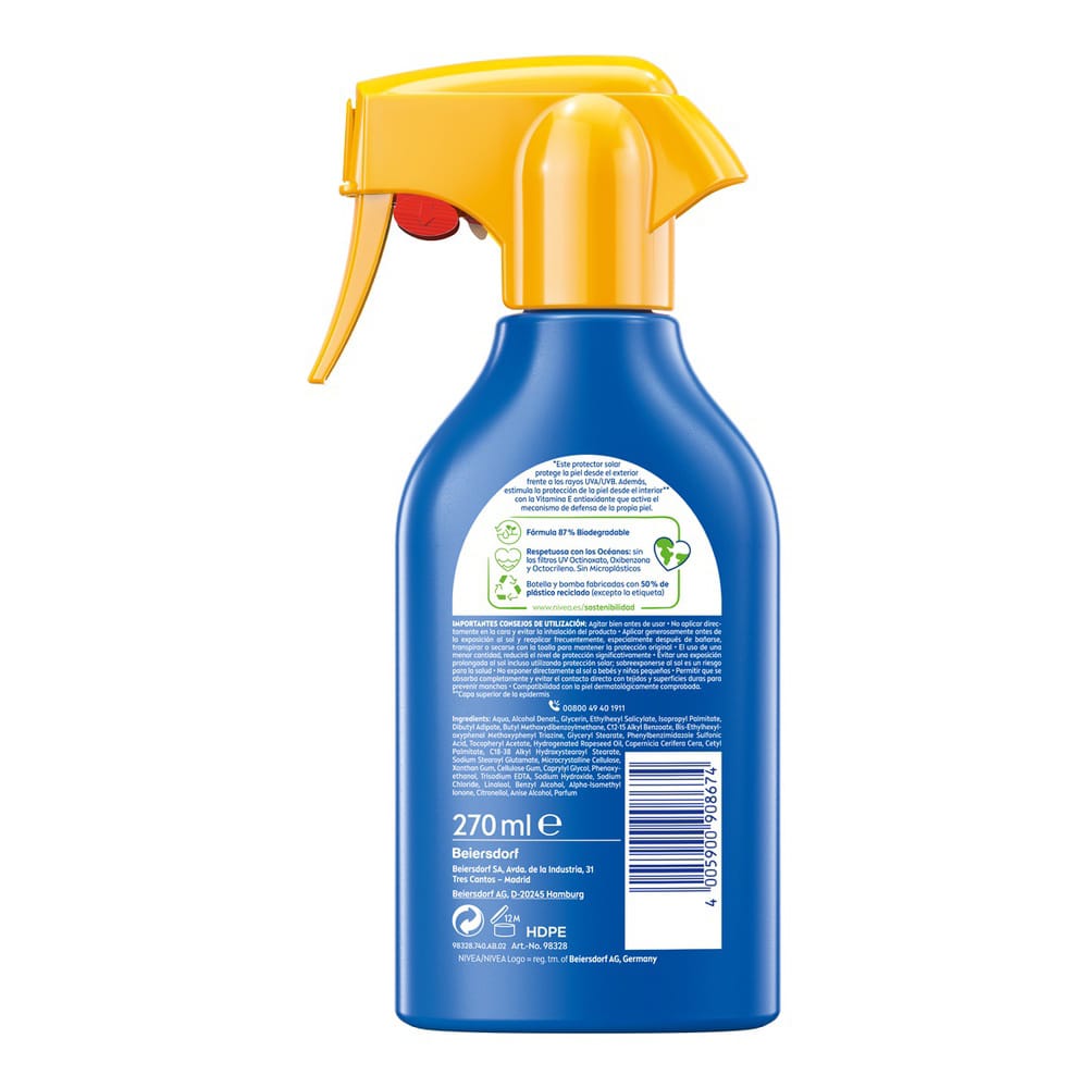 NIVEA SUN Protege & Hidrata Spray Solar FP20 proporciona protección inmediata contra los rayos UVA y UVB, quemaduras solares y el envejecimiento prematuro de la piel, proporcionando 48 horas de hidratación. Su fórmula es resistente al agua y actúa en equilibrio con el microbioma de la piel, una capa de bacterias naturales importantes para mantener la salud de la piel. Compatibilidad con la piel dermatológicamente comprobada. NIVEA SUN comprometida con reducir el impacto en el medio ambiente. Respetuosa con los océanos: fórmula sin los filtros UV Octinoxato, Oxibenzona ni Octocrileno. Sin Microplásticos. Fórmula 87% Biodegradable. Completa tu rutina de protección solar con la gama NIVEA SUN Protección Facial y cuida tu piel después de la exposición solar con NIVEA SUN After Sun.