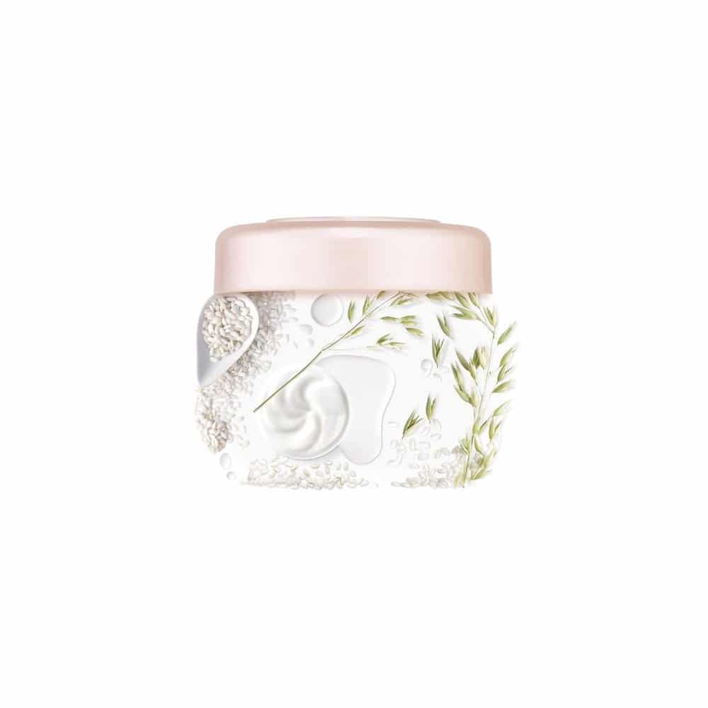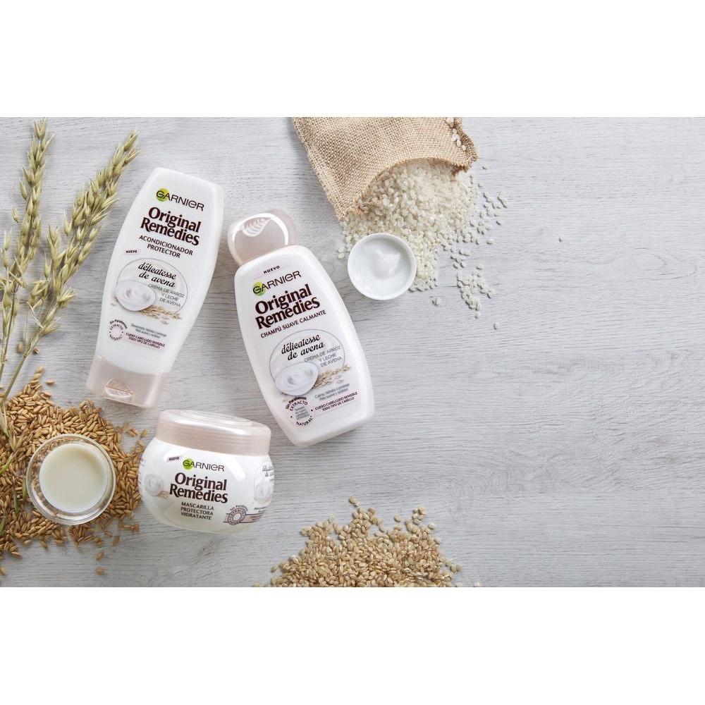 Formulado con Leche de Avena, conocida por sus virtudes de ciudado y protección del cabello; y con Crema de Arroz, utilizada en el cuidado de las pieles delicadas y conocida por calmar y suavizar el cuero cabelludo sensible