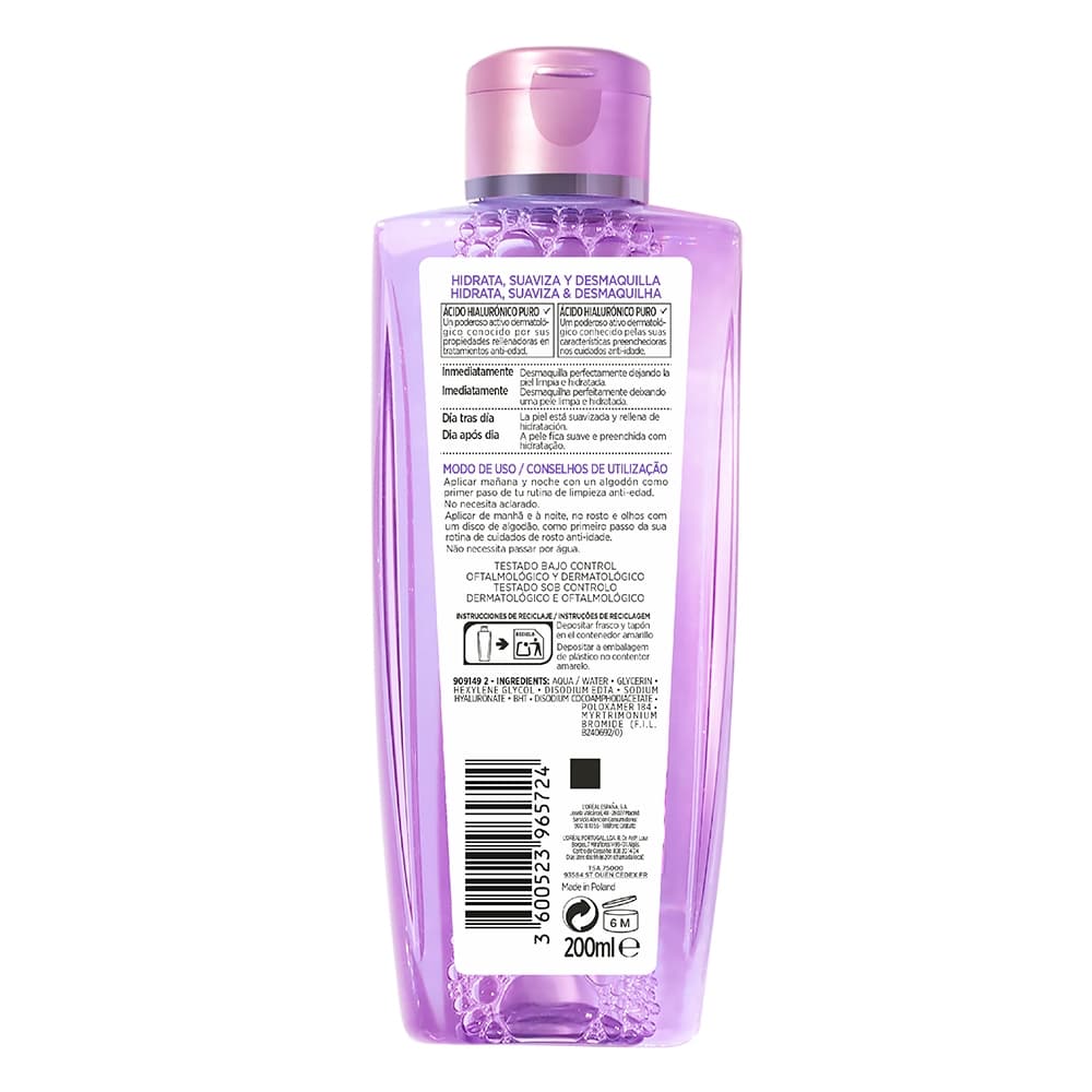 Agua Micelar Loréal Revitalift Filler desmaquilla ojos y rostro perfectamente dejando la piel limpia e hidratada.