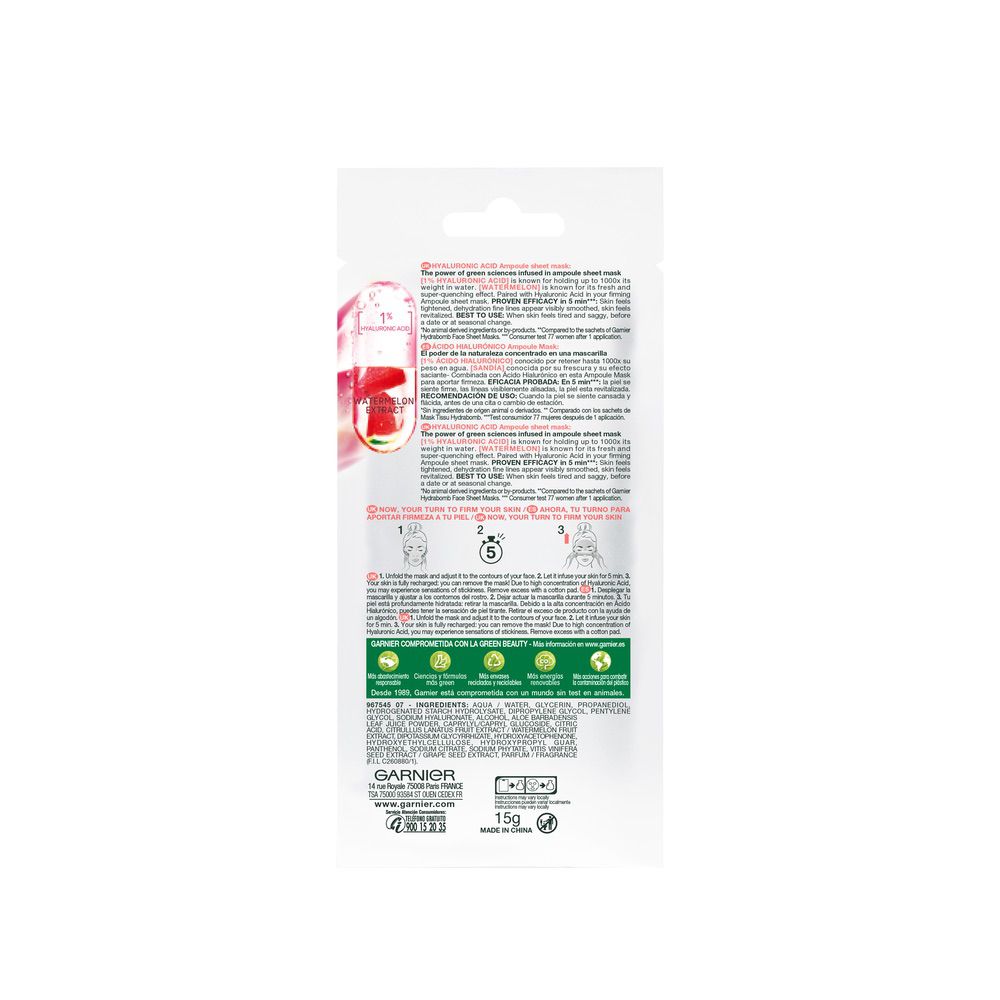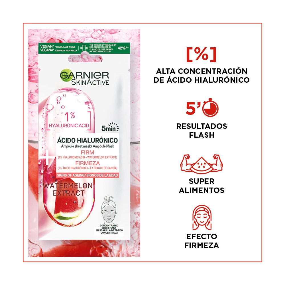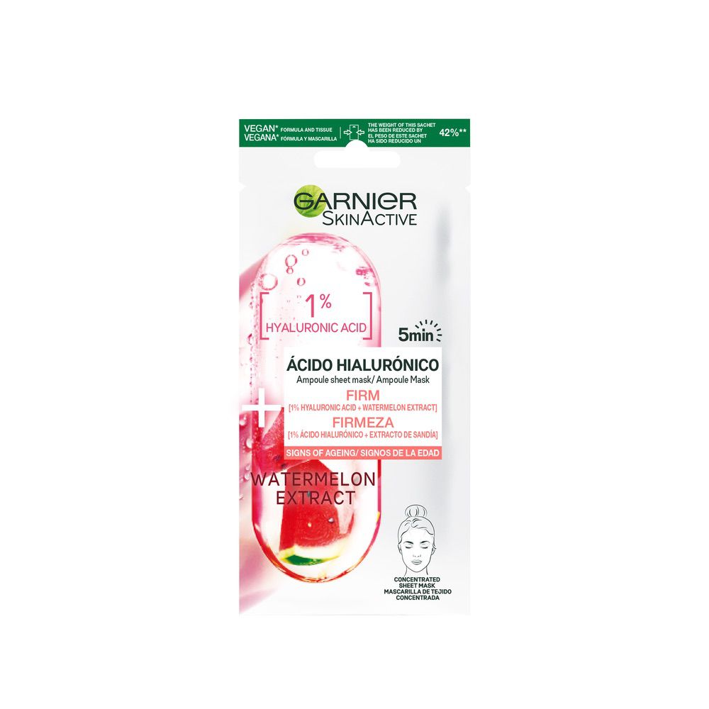 Garnier Ampoule Mask Mascarilla de Tejido Reafirmante con Ácido Hialurónico conocido por retener hasta 1000x su peso en agua y extracto de Sandía conocida por su frescura y su efecto saciante – Combinada con Ácido hialurónico para aportar firmeza a la piel. EFICACIA PROBADA: En 5 minutos*: la piel se siente firme, las líneas visiblemente alisadas, la piel esta revitalizada.